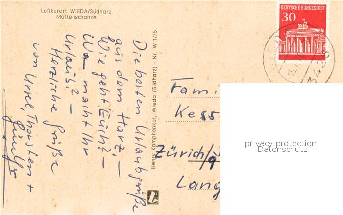 73829640 alte Postkarte Wieda Mattenschanze postalisch gelaufen Erhaltung siehe scans [FriedD77] KatCode: 11110003156013