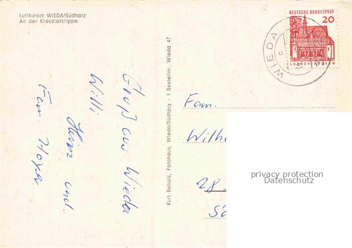 34145395 Wieda Osterode Harz Niedersachsen An der Kreuztalklippe postalisch gelaufen Erhaltung siehe scans [WerneD78] alte Postkarte Wern Katcode 11110003156013
