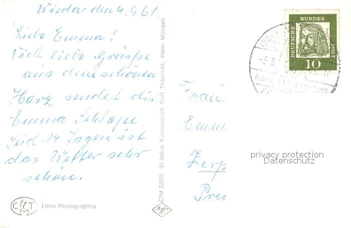 72961976 alte Postkarte Wieda Panorama Blick von der Kreuztalsklippe Oberdorf Kastental Bachlauf Kaeseberg Knicking Kurort Suedharz postalisch gelaufen Erhaltung siehe scans [FriedD77] KatCode: 11110003156013