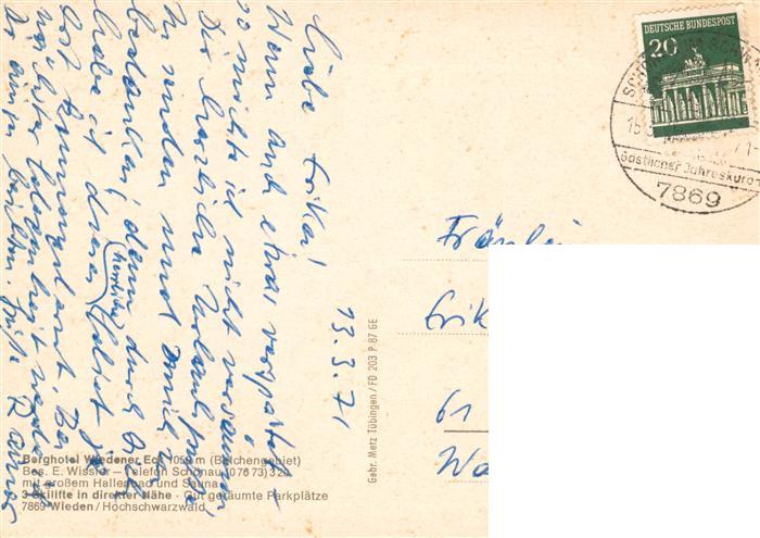73946274 alte Postkarte Wieden Schwarzwald BW Berghotel Wiedener Eck Hallenbad Skilift postalisch gelaufen Erhaltung siehe scans [WerneD78] KatCode: 11110008336096