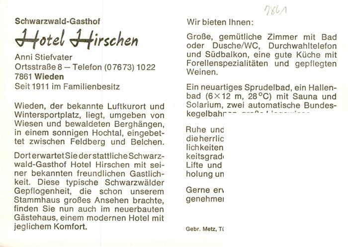 73928328 Wieden Schwarzwald Hotel Hirschen Schwarzwald Gasthof Hallenbad Gastraum postalisch nicht gelaufen Werbekarte (keine Postkarte) Erhaltung siehe scans [WerneD78] KatCode: 11110008336096