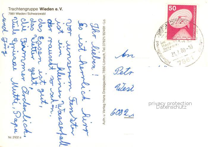 73724308 alte Postkarte Wieden Schwarzwald Trachtengruppe Wieden e.V. postalisch gelaufen Erhaltung siehe scans [LiesaD40] KatCode: 11110008336096