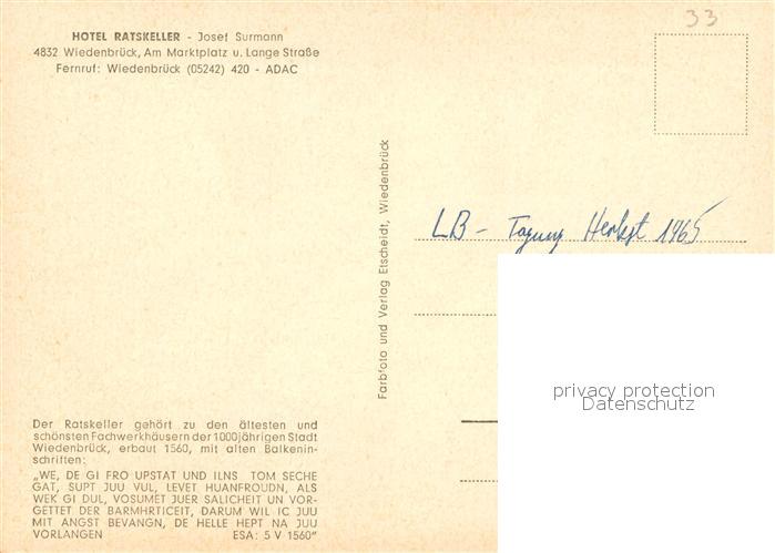 73748122 Wiedenbrueck Hotel Ratskeller postalisch nicht gelaufen Erhaltung siehe scans [WerneD78] KatCode: 11110005754028