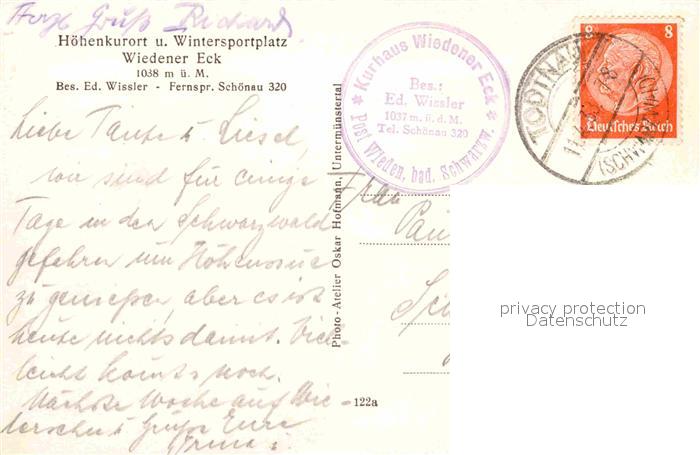72812715 alte Postkarte Wiedener Eck Panorama Schwarzwald postalisch gelaufen Erhaltung siehe scans [FriedD77] KatCode: 11110008336096