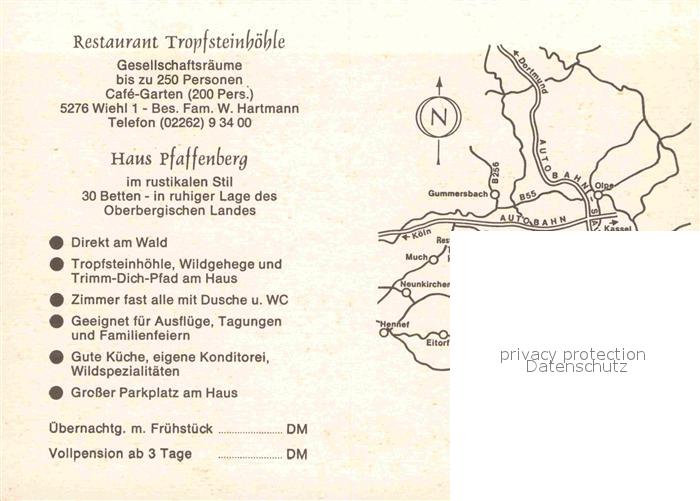 72719404 Wiehl Oberbergischer Kreis Restaurant Tropfsteinhoehle Haus Pfaffenberg postalisch nicht gelaufen Werbekarte (keine Postkarte) Erhaltung siehe scans [FriedD77] KatCode: 11110005374048