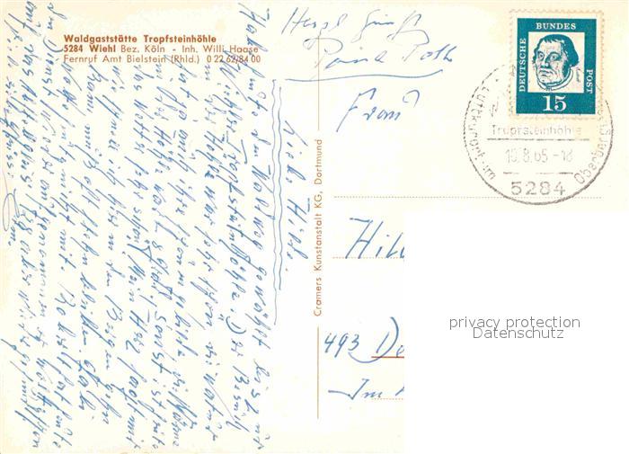 72801041 alte Postkarte Wiehl Oberbergischer Kreis Waldgaststaette Tropfsteinhoehle Schloss Homburg Rathaus Jugendherberge Partie an der Wiehl postalisch gelaufen Erhaltung siehe scans [FriedD77] KatCode: 11110005374048