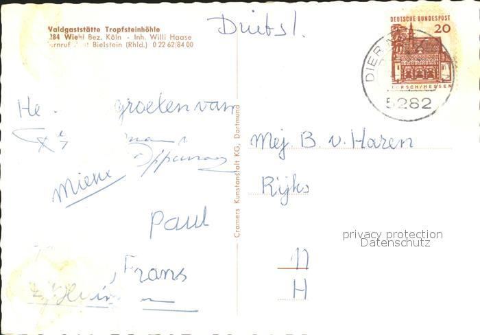 72304959 alte Postkarte Wiehl Oberbergischer Kreis Waldgaststaette Tropfsteinhoehle Schloss-Homburg postalisch gelaufen Erhaltung siehe scans KatCode: 11110005374048