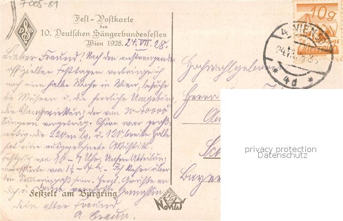 43217959 WIEN AT Fest Postkarte des Dt Saengerbundesfestes 1928 postalisch gelaufen Erhaltung siehe scans [WerneD78] alte Postkarte Wern Katcode 11390130090001
