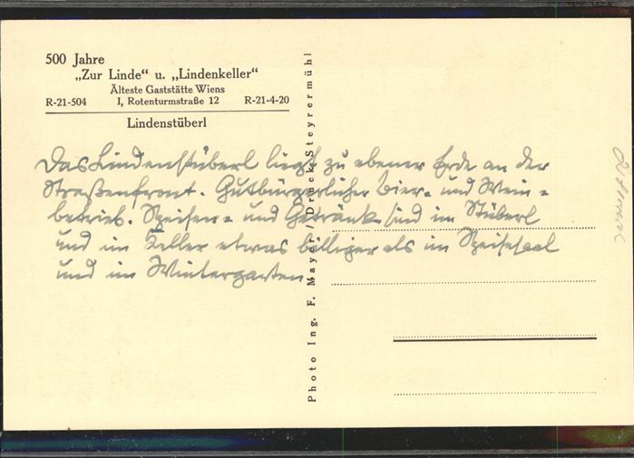 11110350 WIEN AT Zur Linde Lindenstueberl postalisch nicht gelaufen Alte Ansichtskarte Postkarte Elvi Katcode 11390130090001