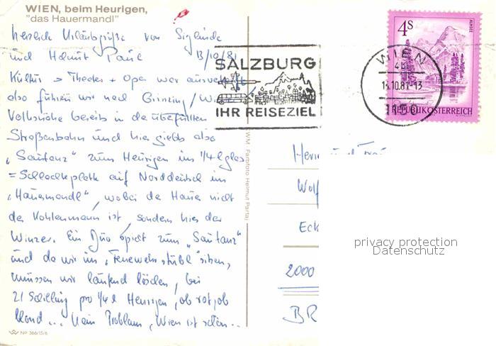 72756189 alte Postkarte Wien Beim Heurigen Das Hauermandl postalisch gelaufen Erhaltung siehe scans [LiesaD40] KatCode: 11390130090001