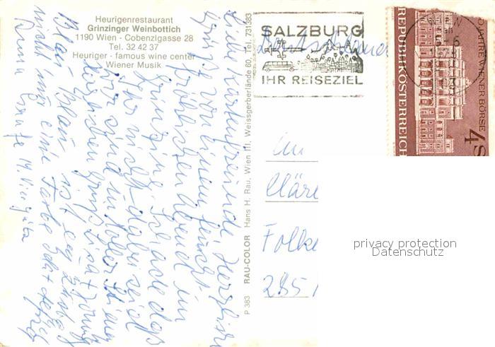 72666488 alte Postkarte Wien Grinzinger Weinbottich Heurigenrestaurant Livemusik Kirche postalisch gelaufen Erhaltung siehe scans [FriedD77] KatCode: 11390130090001