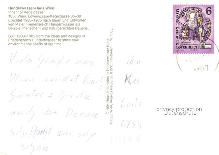 73165018 alte Postkarte Wien Hundertwasser Haus Innenhof Kegelgasse postalisch gelaufen Erhaltung siehe scans [WerneD78] KatCode: 11390130090001
