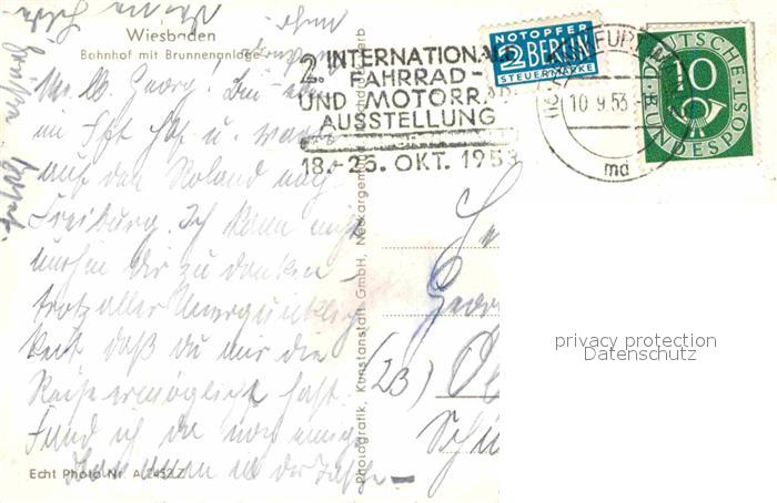 72792501 alte Postkarte Wiesbaden Bahnhof Brunnenanlagen postalisch gelaufen Erhaltung siehe scans [AndreD76] KatCode: 11110006414000