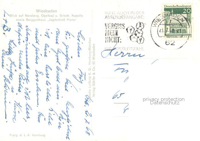 73785214 alte Postkarte Wiesbaden Blick auf Neroberg Opelbad Griech Kapelle und Berggasthaus Jagdschloss Platte postalisch gelaufen Erhaltung siehe scans [WerneD78] KatCode: 11110006414000