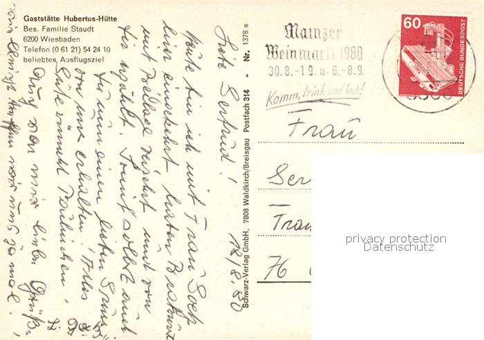 73321248 alte Postkarte Wiesbaden Gaststaette Hubertus Huette Terrasse postalisch gelaufen Erhaltung siehe scans [FriedD77] KatCode: 11110006414000