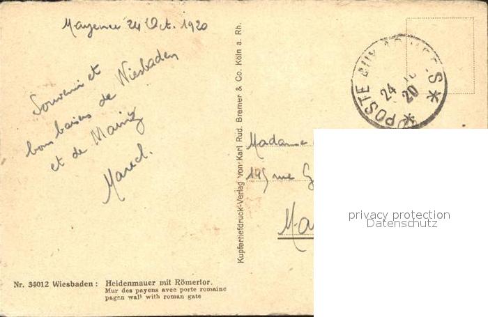 72422362 alte Postkarte Wiesbaden Heidemauer mit Roemertor postalisch gelaufen Erhaltung siehe scans KatCode: 11110006414000