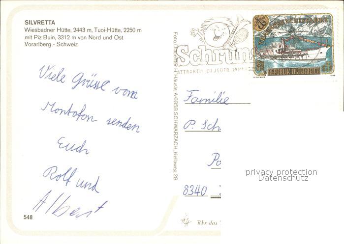 71566613 alte Postkarte Wiesbadener Huette und Tuoi Huette mit Piz Buin Schutzhuette Silvretta postalisch gelaufen Erhaltung siehe scans KatCode: 11390