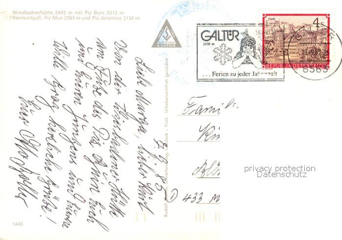 73491936 alte Postkarte Wiesbadener Huette Vermuntpass Piz Mon und Piz Jeremias postalisch gelaufen Erhaltung siehe scans [WerneD78] KatCode: 11390