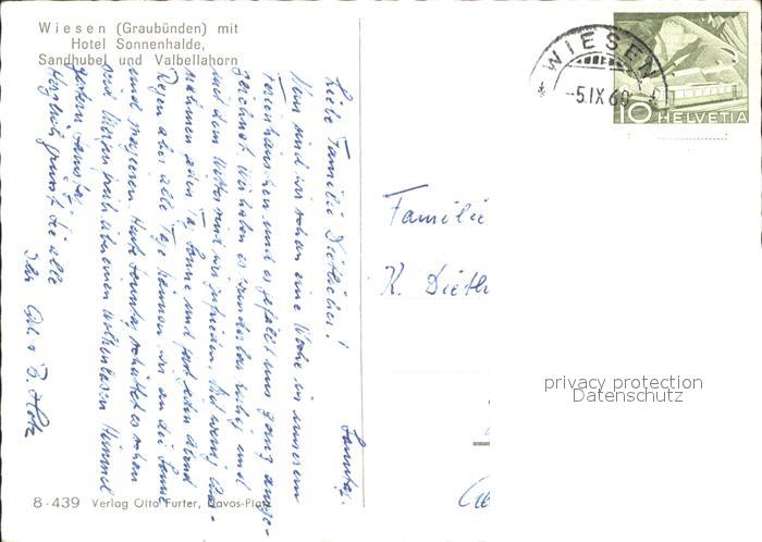 11641349 alte Postkarte Wiesen Albula Ortsansicht mit Hotel Sonnenhalde Blick zum Sandhubel Valbellahorn Plessur Alpen postalisch gelaufen Erhaltung siehe scans KatCode: 11470100305988