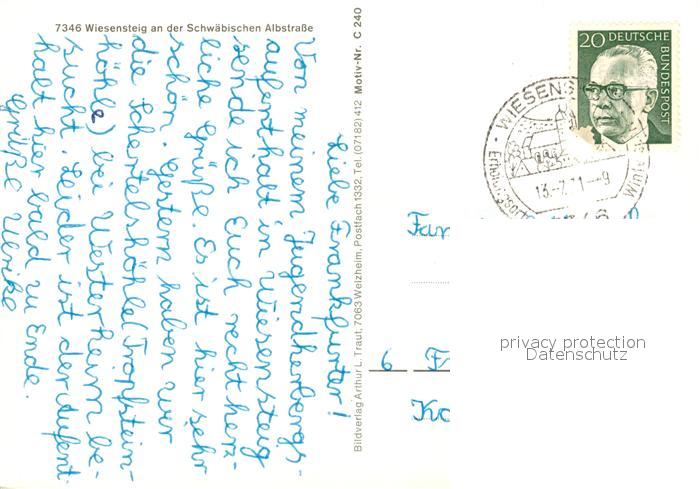 73180864 alte Postkarte Wiesensteig Ortsansicht mit Kirche Brunnen Altstadt Fachwerkhaus Viadukt Schwaebische Albstrasse postalisch gelaufen Erhaltung siehe scans [FriedD77] KatCode: 11110008117058