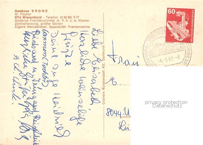 73777408 alte Postkarte Wiesentheid Gasthaus Krone Schloss Park Kirche postalisch gelaufen Erhaltung siehe scans [FriedD77] KatCode: 11110009675178