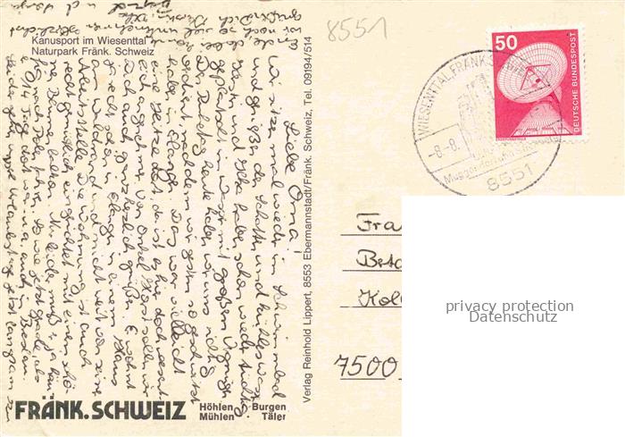 74049957 alte Postkarte Wiesenttal Forchheim Bayern Kanusport im Wiesenttal Naturpark Fraenkische Schweiz postalisch gelaufen Erhaltung siehe scans [FriedD77] KatCode: 11110009474176