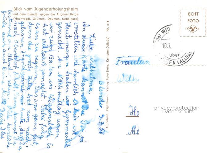 72952819 alte Postkarte Wiggensbach Panorama Blick vom Jugenderholungsheim auf dem Blender gegen Allgaeuer Berge postalisch gelaufen Erhaltung siehe scans [FriedD77] KatCode: 11110009780146