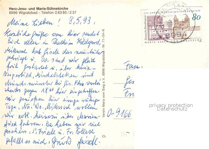 72616626 alte Postkarte Wigratzbad Herz Jesu und Maria Suehnekirche Maria vom Sieg Heiligenfiguren postalisch gelaufen Erhaltung siehe scans [FriedD77] KatCode: 11110009776122