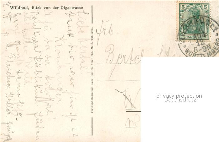 73769173 alte Postkarte Wildbad Schwarzwald Blick von der Olgastrasse postalisch gelaufen Erhaltung siehe scans [FriedD77] KatCode: 11110008235079