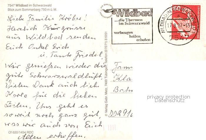 73814356 alte Postkarte Wildbad Schwarzwald Blick zum Sommerberg postalisch gelaufen Erhaltung siehe scans [FriedD77] KatCode: 11110008235079