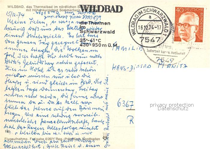 73264491 alte Postkarte Wildbad Schwarzwald Fliegeraufnahme Sommerberg postalisch gelaufen Erhaltung siehe scans [PaolaD17] KatCode: 11110008235079