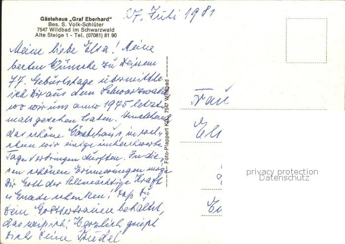 72543640 alte Postkarte Wildbad Schwarzwald Gaestehaus Graf Eberhard postalisch gelaufen Erhaltung siehe scans [WerneD78 kv016box] KatCode: 11110008235079