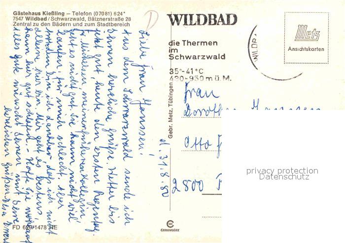 72778979 alte Postkarte Wildbad Schwarzwald Gaestehaus Kiessling postalisch gelaufen Erhaltung siehe scans [FriedD77] KatCode: 11110008235079