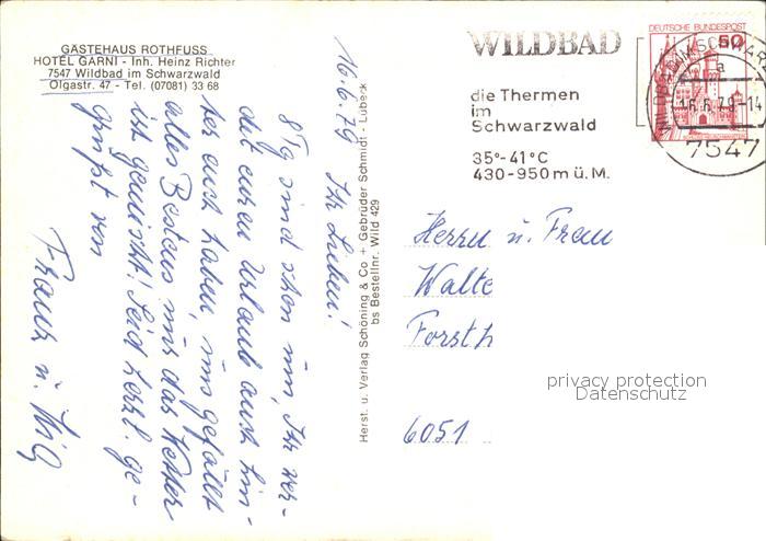 72411425 alte Postkarte Wildbad Schwarzwald Gaestehaus Rothfuss Hotel Garni postalisch gelaufen Erhaltung siehe scans KatCode: 11110008235079