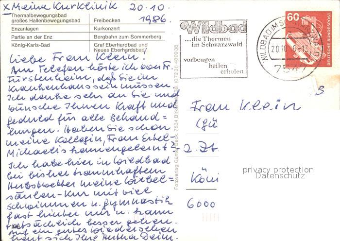 72453602 alte Postkarte Wildbad Schwarzwald Hallenbad Enzanlagen Koenig Karls Bad Total Freibecken Kurkonzert Bergbahn Graf Eberhardbad postalisch gelaufen Erhaltung siehe scans KatCode: 11110008235079