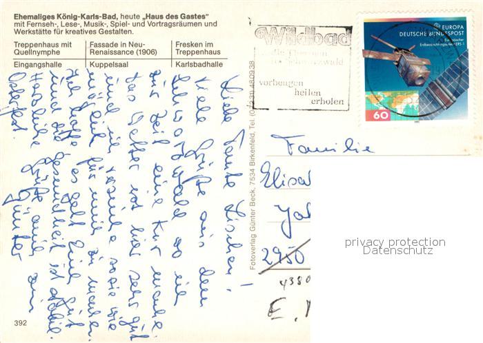 73718087 alte Postkarte Wildbad Schwarzwald Haus des Kurgastes Treppenhaus mit Quellnymphe Eingangshalle Fassade Kuppelsaal Fresken im Treppenhaus Karlsbadhalle postalisch gelaufen Erhaltung siehe scans [WerneD78] KatCode: 11110008235079
