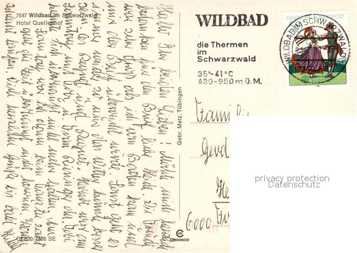 73666626 alte Postkarte Wildbad Schwarzwald Hotel Quellenhof postalisch gelaufen Erhaltung siehe scans [WerneD78] KatCode: 11110008235079