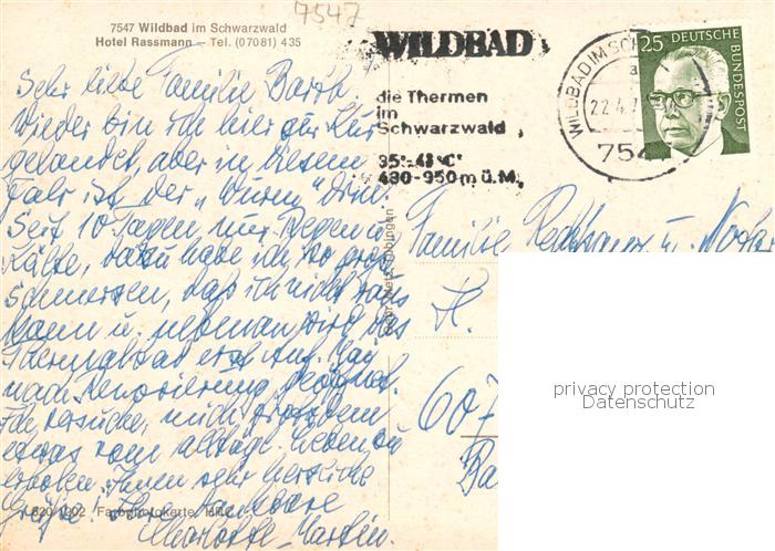 73870766 alte Postkarte Wildbad Schwarzwald Hotel Rassmann postalisch gelaufen Erhaltung siehe scans [WerneD78] KatCode: 11110008235079