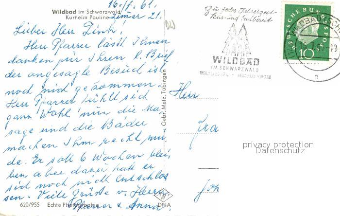 72843077 alte Postkarte Wildbad Schwarzwald Kurheim Pauline postalisch gelaufen Erhaltung siehe scans [FriedD77] KatCode: 11110008235079