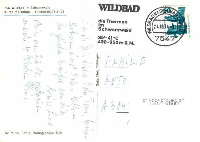 72773288 alte Postkarte Wildbad Schwarzwald Kurheim Pauline postalisch gelaufen Erhaltung siehe scans [FriedD77] KatCode: 11110008235079