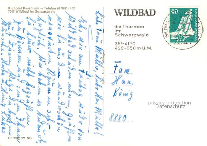 73129743 alte Postkarte Wildbad Schwarzwald Kurhotel Rassmann postalisch gelaufen Erhaltung siehe scans [NatalD47] KatCode: 11110008235079