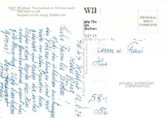 72658150 alte Postkarte Wildbad Schwarzwald Kurplatz evangelische Stadtkirche postalisch gelaufen Erhaltung siehe scans [AndreD76] KatCode: 11110008235079