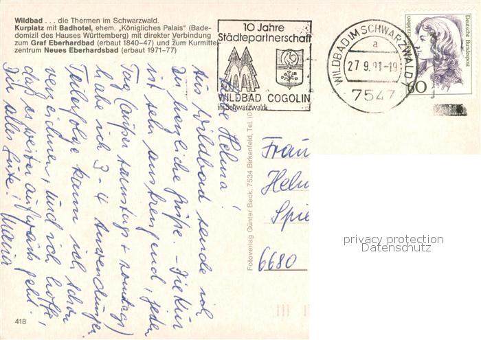 73719334 alte Postkarte Wildbad Schwarzwald Kurplatz mit Badhotel postalisch gelaufen Erhaltung siehe scans [LiesaD40] KatCode: 11110008235079