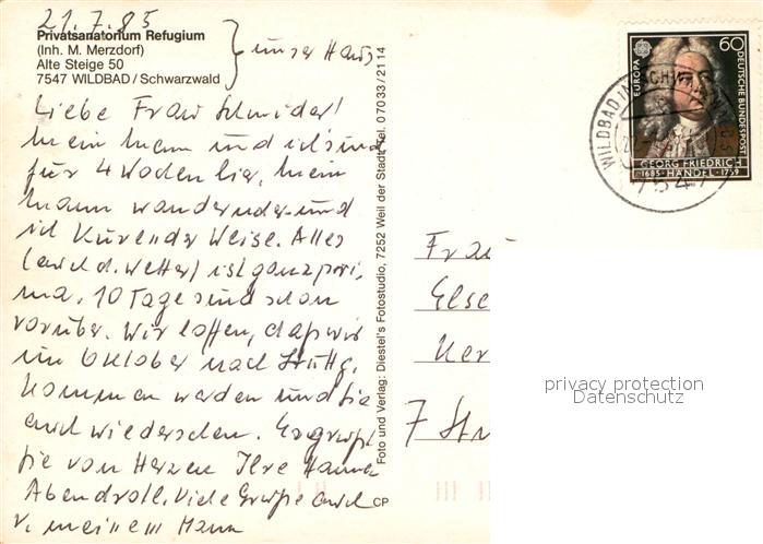 73017282 alte Postkarte Wildbad Schwarzwald Privatsanatorium Refugium postalisch gelaufen Erhaltung siehe scans [NatalD47] KatCode: 11110008235079