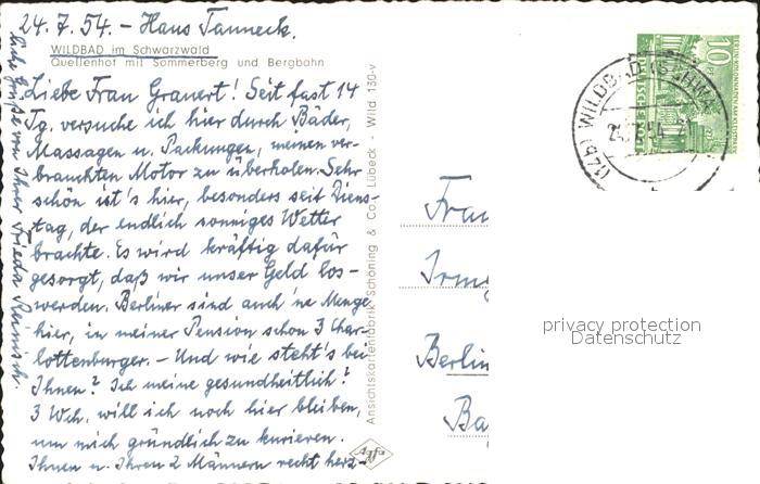 72270975 alte Postkarte Wildbad Schwarzwald Quellenhof mit Sommberberg und Bergbahn postalisch gelaufen Erhaltung siehe scans KatCode: 11110008235079