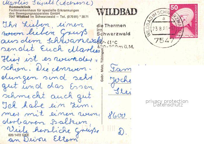 72667023 alte Postkarte Wildbad Schwarzwald rommelklinik postalisch gelaufen Erhaltung siehe scans [LiesaD40] KatCode: 11110008235079