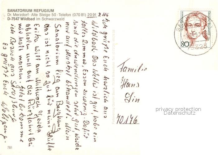 72940114 alte Postkarte Wildbad Schwarzwald Sanatorium Refugium postalisch gelaufen Erhaltung siehe scans [KathaD81] KatCode: 11110008235079
