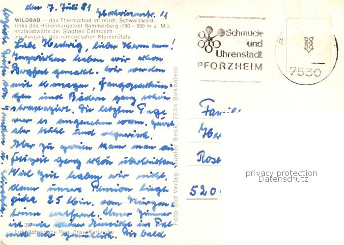 72961389 alte Postkarte Wildbad Schwarzwald Sommerberg Calmbach Kleinenztal Fliegeraufnahme postalisch gelaufen Erhaltung siehe scans [PaolaD17] KatCode: 11110008235079