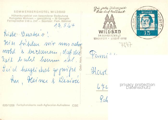73163202 alte Postkarte Wildbad Schwarzwald Sommerberghotel postalisch gelaufen Erhaltung siehe scans [WerneD78] KatCode: 11110008235079