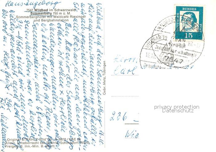 73689740 alte Postkarte Wildbad Schwarzwald Sommerberghotel mit Waldcafe Riexinger Fliegeraufnahme postalisch gelaufen Erhaltung siehe scans [WerneD78] KatCode: 11110008235079